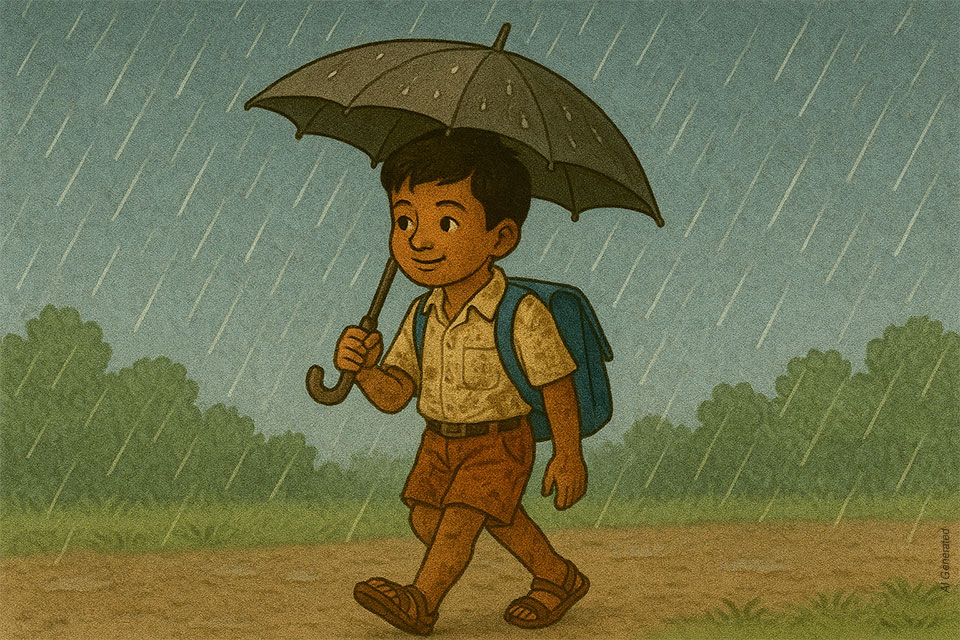 പാതിയുടല് കുതിര്ന്ന്, കുടയും ചൂടി
